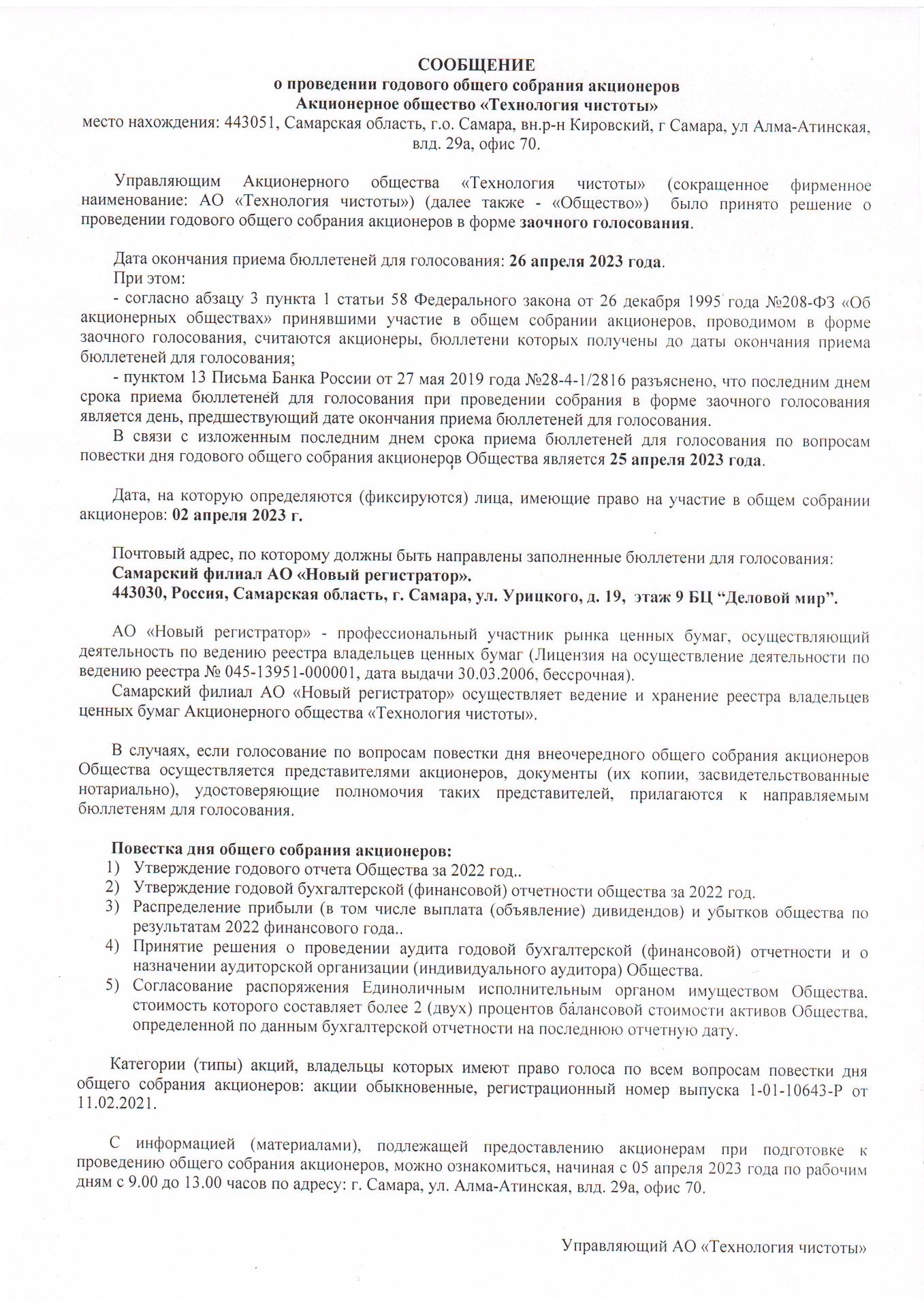 Информация по Годовому Общему собранию акционеров АО "Технология чистоты"