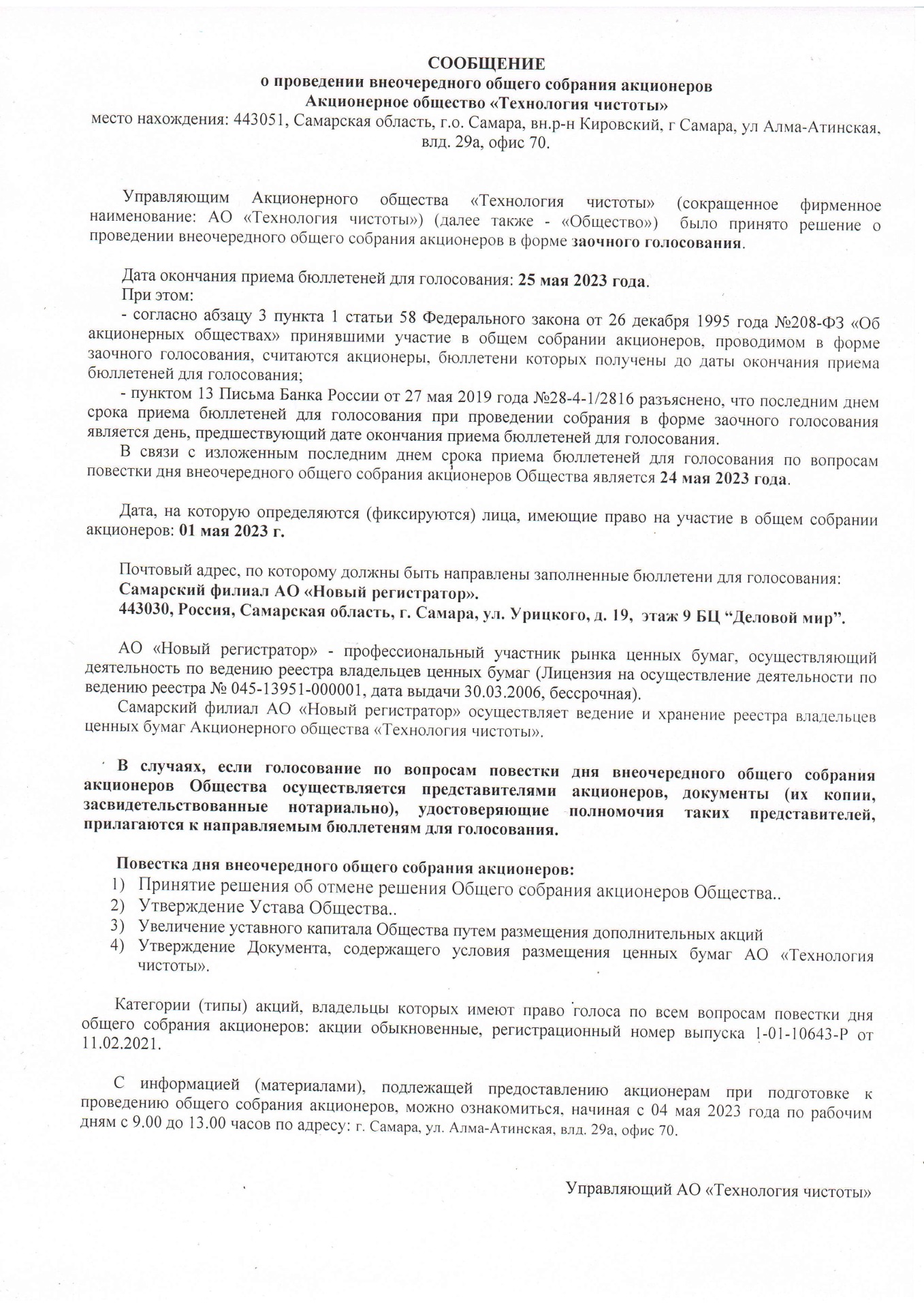 Акционерам АО "Технология чистоты"