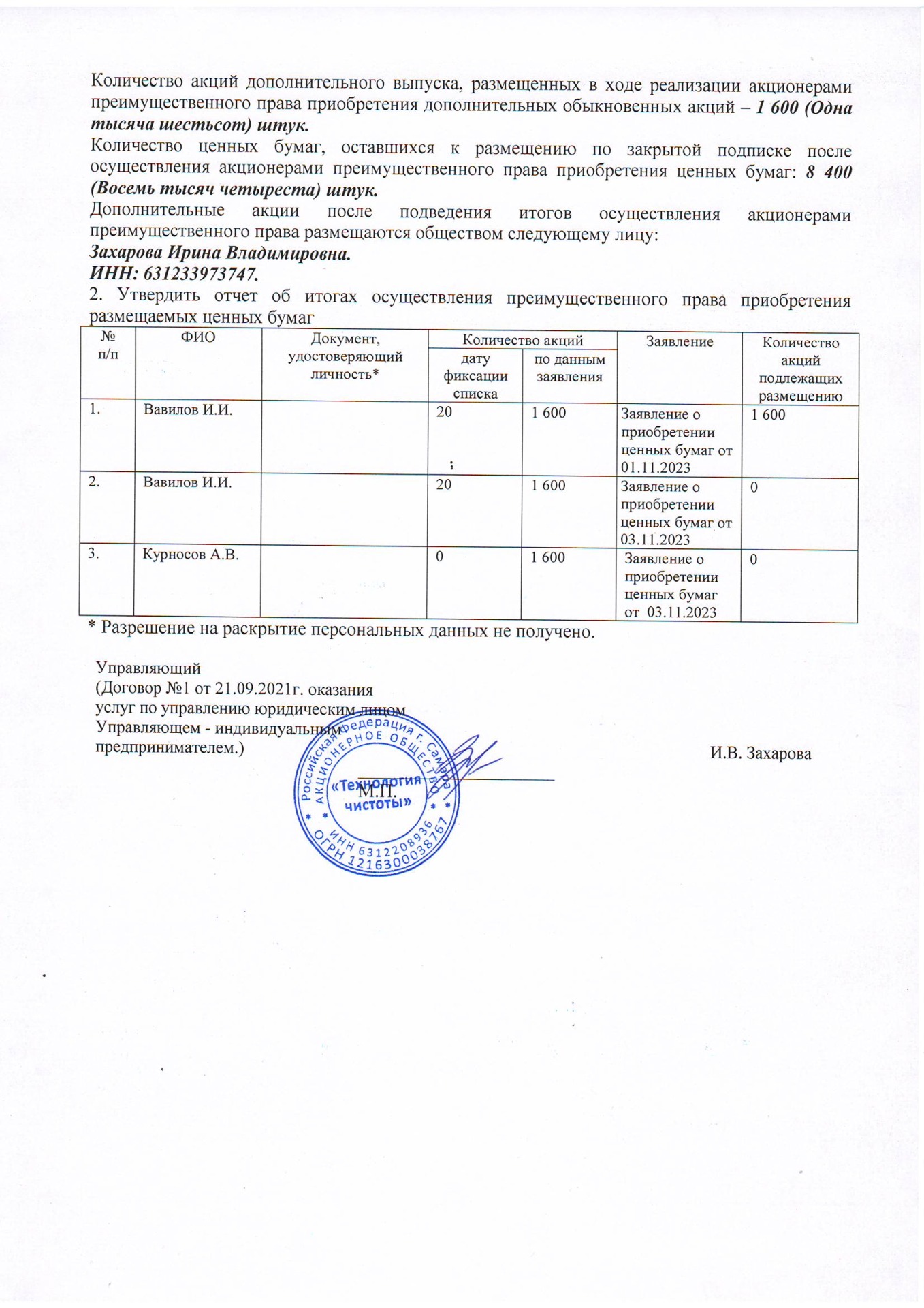 Акционерам АО "Технология чистоты"